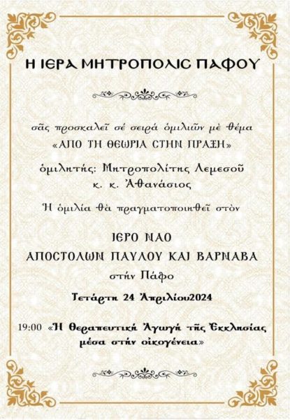 Ομιλία με θέμα: “Η θεραπευτική αγωγή της Εκκλησίας μέσα στην οικογένεια” θα πραγματοποιήσει ο Πανιερώτατος Μητροπολίτης Λεμεσού κ. Αθανάσιος στον Ιερό Ναό Αποστόλου Βαρνάβα στην Πάφο, την Τετάρτη 24 Απριλίου 2024, στις 7 το απόγευμα.