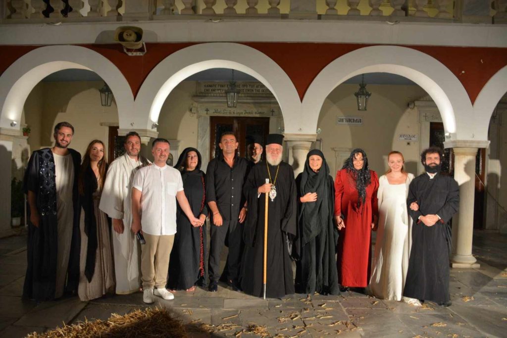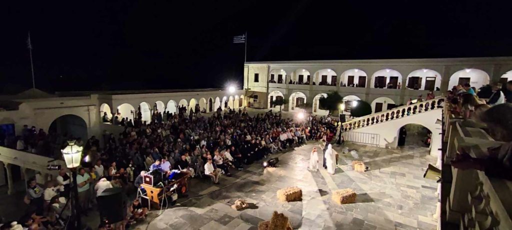 Για πρώτη φορά στην Ιστορία του θεάτρου, μια θεατρική παράσταση παρουσιάστηκε στον αύλειο χώρο της Μεγαλόχαρης της Τήνου, κατόπιν της τιμητικής πρόσκλησης απο το Πανελλήνιο Ιερό Ίδρυμα Ευαγγελιστρίας Τήνου και του Σεβασμιωτάτου Μητροπολίτη Σύρου, Τήνου, Άνδρου, Κέας και Μήλου κ. Δωρόθεου Β’ με αφορμή τα 200 Χρόνια από την Εύρεση της Πανσέπτου Εικόνας του Ευαγγελισμού της Θεοτόκου. Παρακολούθησαν πανω απο 900 άτομα την καθηλωτική παράσταση οπου καταχειροκροτήθηκε και απέσπασε άριστες εντυπώσεις από τους θεατές, οι οποίοι ήταν Τήνιοι, παραθεριστές και παρεπιδημούντες προσκυνητές.