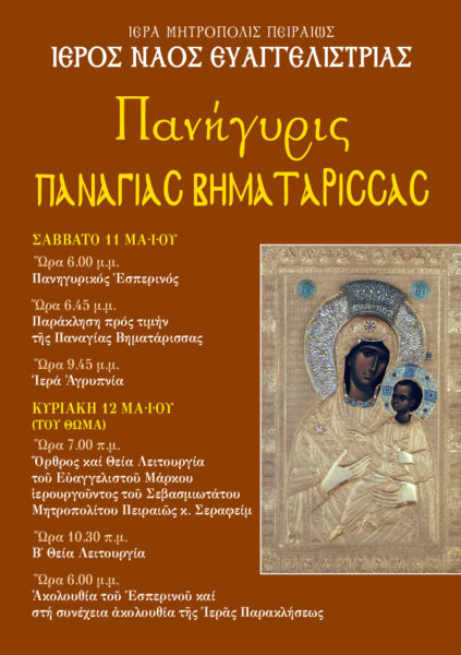 Την Παναγία την Βηματάρισσα τιμά ο Ιερός Ναός Ευαγγελίστριας Πειραιώς το Σαββατοκύριακο της Διακαινησίμου (11-12 Μαΐου), αφού την εβδομάδα αμέσως μετά την Κυριακή του Πάσχα τιμάται η Θεοτόκος, που είδε τον υιό της και υιό του Θεού να σταυρώνεται και να ανασταίνεται!
