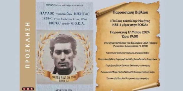 Παρουσιάστηκε στην Πάφο το βιβλίο «Παύλος τουπίκλην Νικήτας 1438+1 μέρες στην ΕΟΚΑ», που διοργάνωσε η οικογένεια του αγωνιστή της ΕΟΚΑ Παύλου Νικήτα σε συνεργασία με το Κολέγιο CDA, τις 17 Μαΐου.