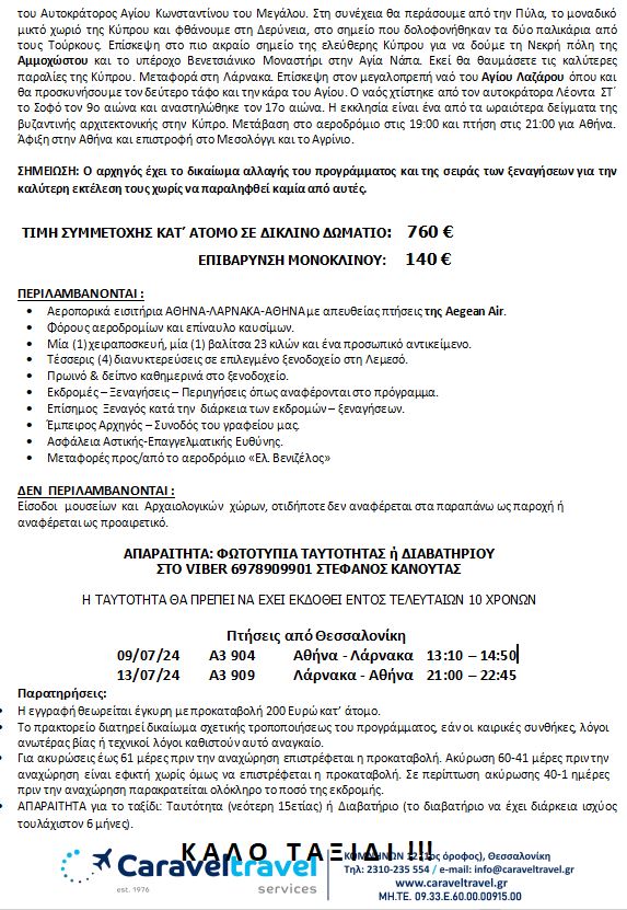 Η Ιερά Μητρόπολη Αιτωλίας και Ακαρνανίας διοργανώνει πενθήμερη προσκυνηματική εκδρομή στο μαρτυρικό νησί της Κύπρου, από την Τρίτη 9 Ιουλίου έως και την Παρασκευή 13 Ιουλίου 2024.