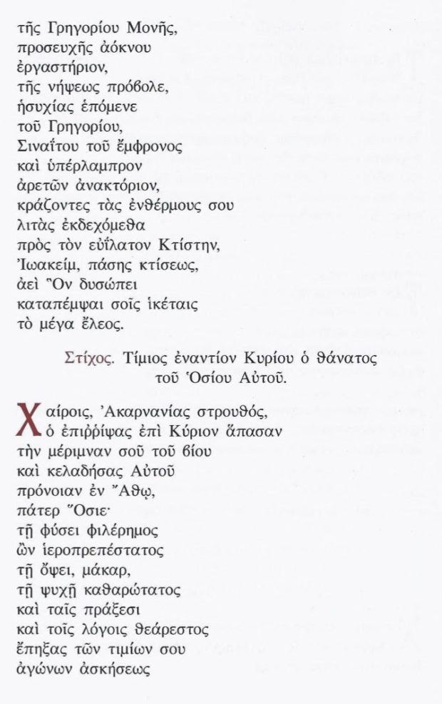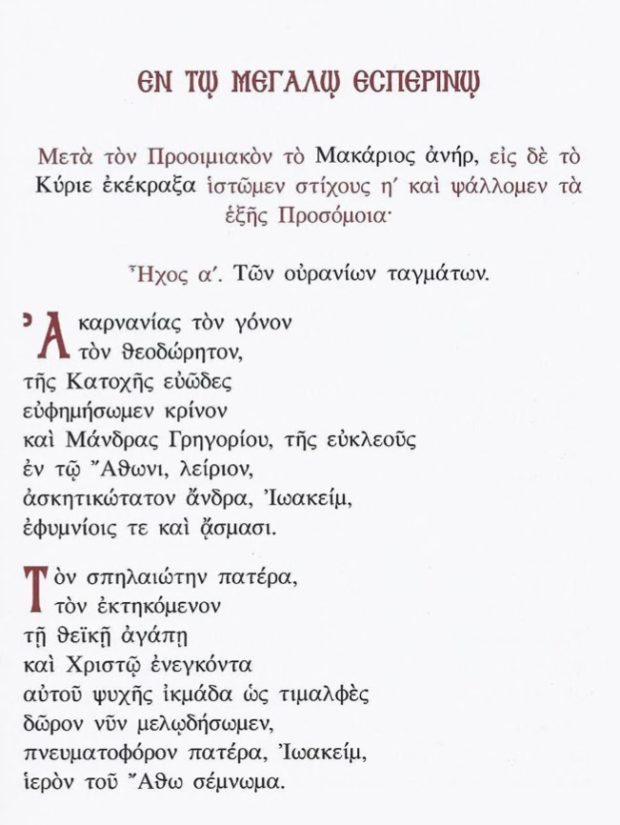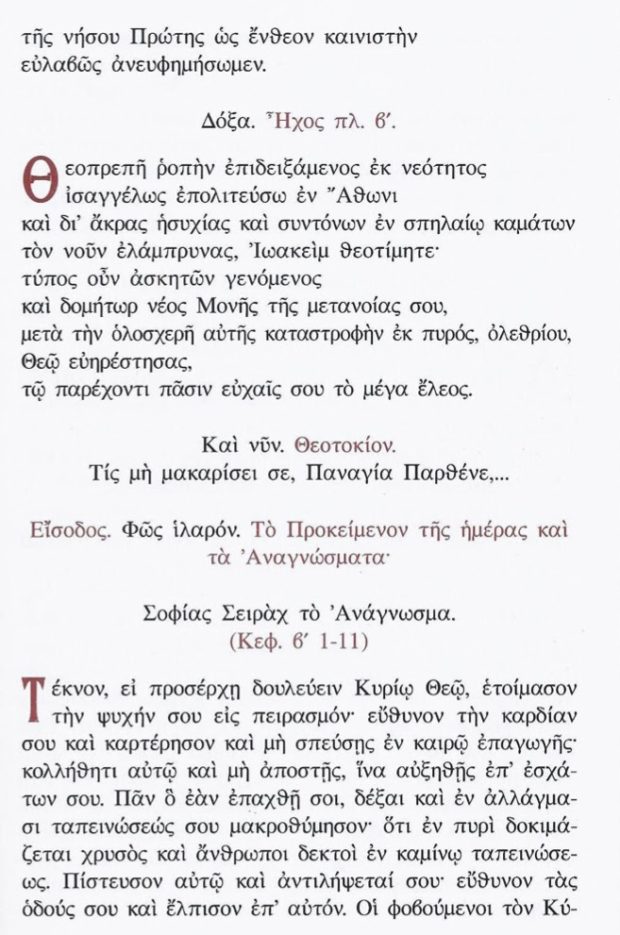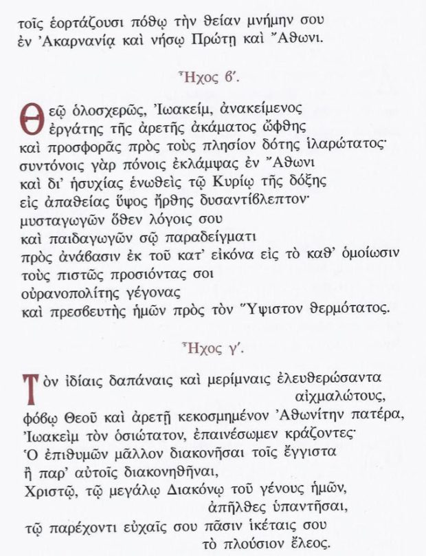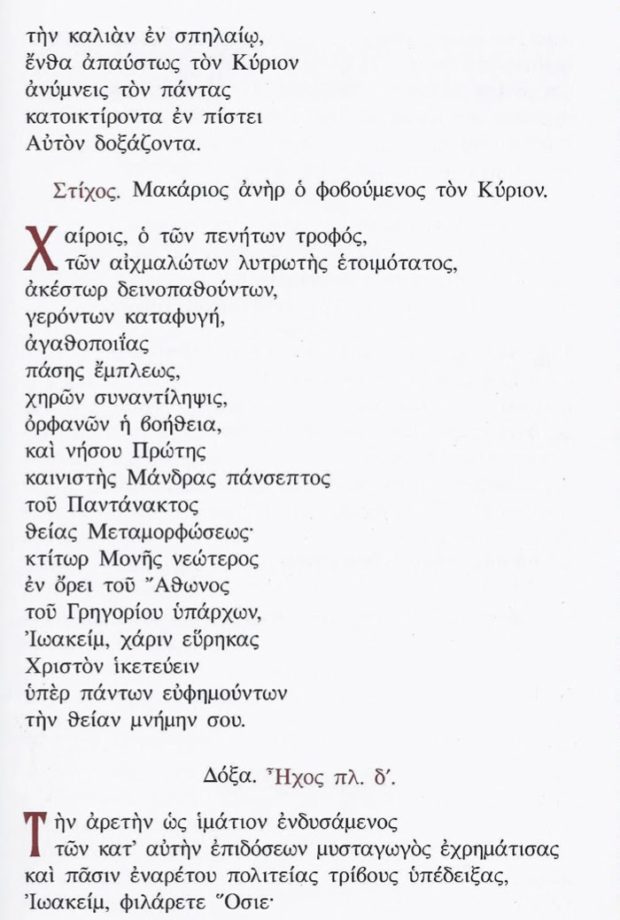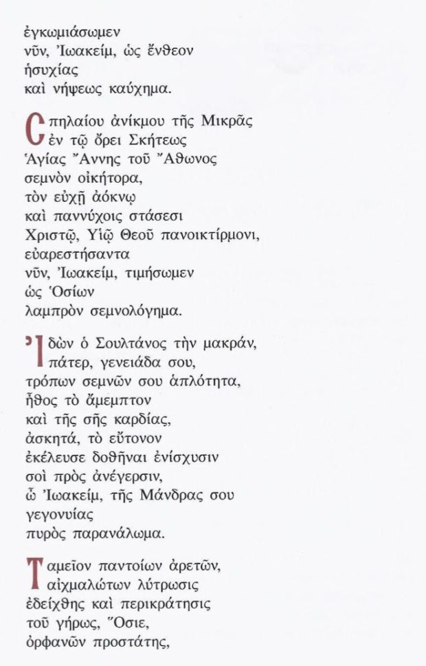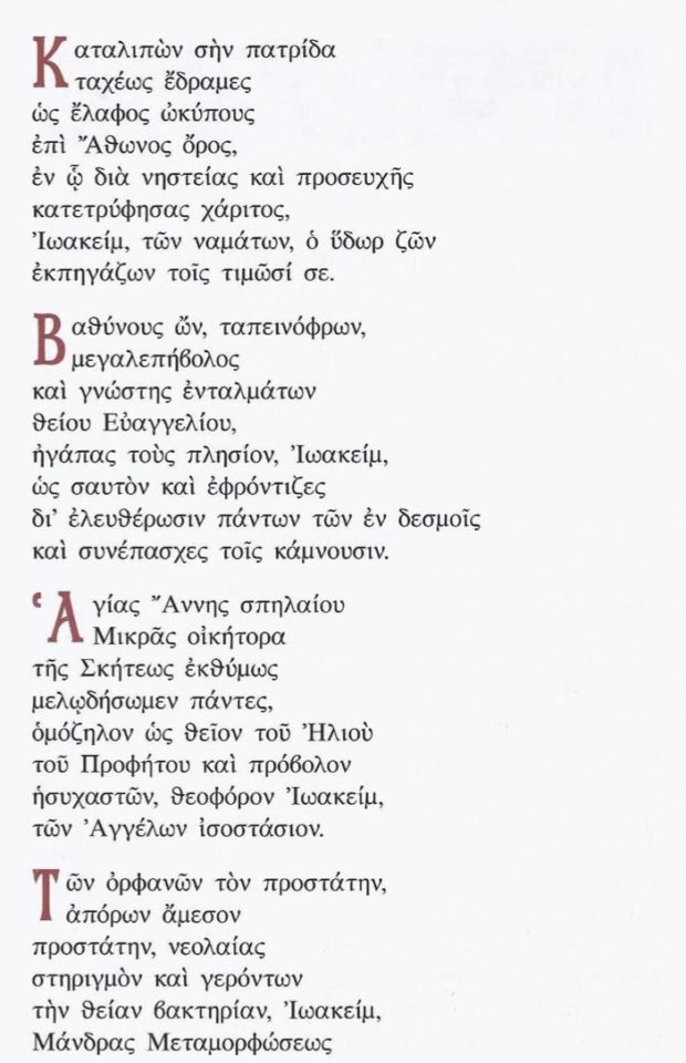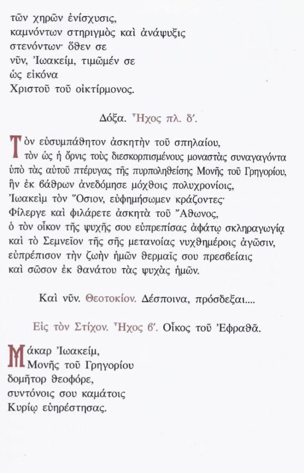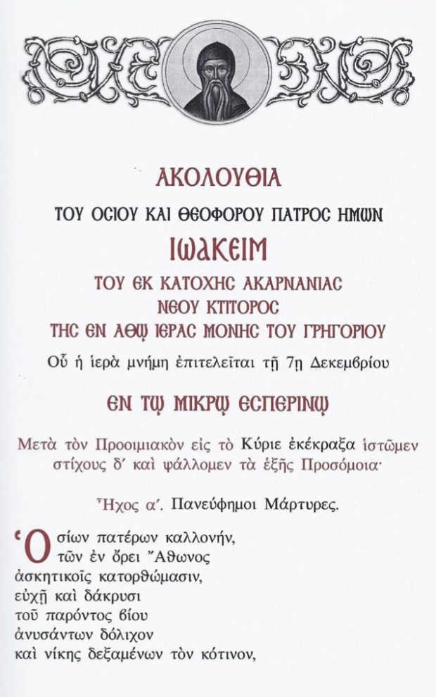 Τη μεγάλη αυτή φυσιογνωμία, που η μνήμη του τιμάται στο Άγιον Όρος και μάλιστα στη Μονή του Οσίου Γρηγορίου, μαζί με τους κτίτορες της Μονής, στα κτιτορικά, την επομένη της Εορτής του Καθολικού της, του Αγίου Νικολάου, Επισκόπου Μύρων, του θαυματουργού, προβάλουμε σήμερα με την έκδοση του Συναξαρίου του και της Ακολουθίας του. Η παρούσα εργασία αποτελεί προιόν επιθυμίας ανωνύμου, φιλαγίου Μοναχού της Ευβοίας, την οποία αγκάλιασε με μεγάλη προθυμία ο εκδοτικός οίκος ‘Επτάλοφος”, αφού οι φιλακόλουθοι εκδότες του κατάγονται απο την μοναδική μας, Επτάλοφη Βασιλεύουσα, στην οποία έζησε και δίδαξε και έδειξε τα φιλάνθρωπα αισθήματά του ο Όσιος Ιωακείμ και στην νήσο Πρώτη της οποίας ο Όσιος ανακαίνισε τη Μονή της Μεταμορφώσεως του Σωτήρος.