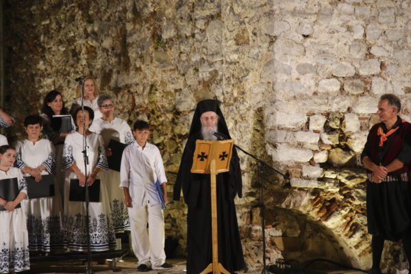 Στο κλείσιμο της εκδήλωσης ο Σεβασμιώτατος Μητροπολίτης Ναυπάκτου και Αγίου Βλασίου κ. Ιερόθεος αφού ευχαρίστησε όλους τους συντελεστές της εκδήλωσης, είπε ότι από την αρχή της τριαντάχρονης ποιμαντορίας του στην Μητρόπολη Ναυπάκτου, εκτός από την θεολογία που διακονεί, κηρύτοντας και συγγράφοντας, επεδίωξε να αναδειχθούν στοιχεία από την παράδοση του τόπου, όπως είναι το δημοτικό τραγούδι, στοιχεία που ενώνουν όλον τον λαό. Αυτό γίνεται με την Χορωδία Παραδοσιακής Μουσικής της Ιεράς Μητροπόλεως, που πραγματοποιεί πολλές εκδηλώσεις μέσα στον χρόνο. Αναφέρθηκε κατόπιν στα γεγονότα της Κύπρου του 1974, όπως τα έζησε ο ίδιος ως νέος Κληρικός, και είπε ότι δεν μπορεί κανείς να ξεχάσει τα αίματα που χύθηκαν, αλλά και το πόσες αποφάσεις του Συμβουλίου Ασφαλείας και των Ηνωμένων Εθνών ελήφθησαν και δεν τηρούνται. Είναι ένα συνεχιζόμενο έγκλημα. Κατόπιν με αφορμή τα τραγούδια για την αγάπη που ακούστηκαν αναφέρθηκε στο τι πραγματικά ζητάει ο άνθρωπος. Στο ερώτημα αυτό απάντησε από την εμπειρία των μεταφράσεων σε όλο τον κόσμο των βιβλίων του που παρουσιάζουν την θεολογία των Πατέρων της Εκκλησίας. Διαπίστωσε ότι οι άνθρωποι ζητούν αληθινή ελευθερία, ανιδιοτελή αγάπη και εσωτερική ησυχία. Αυτό φάνηκε και από τα τραγούδια που ακούστηκαν﮲ θέλουμε την ομορφιά της ελευθερίας, της αγάπης και της εσωτερικής ησυχίας. Τέλος ευχήθηκε καλό μήνα και δροσερό καλοκαίρι με δροσιά ψυχική και πνευματική.