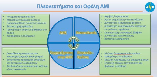Όπως φαίνεται και στον πιο κάτω πίνακα, τα πλεονεκτήματα και τα οφέλη που δημιουργούνται για τις διάφορες κατηγορίες εμπλεκομένων είναι πολλαπλά και εκτείνονται από την ΑΗΚ και τους συμμετέχοντες στην Ανοιχτή Αγορά Ηλεκτρισμού μέχρι τους καταναλωτές και την κοινωνία ευρύτερα. Για τους καταναλωτές, οι επτά σημαντικότερες πτυχές συνοψίζονται ως εξής: Ακριβείς λογαριασμοί, Άμεση ενημέρωση για κατανάλωση, Δυνατότητα διαχείρισης φορτίου, Δυνατότητα εξοικονόμησης ενέργειας και μείωσης τιμολογίου, Γρηγορότερη επαναφορά βλαβών, Δυνατότητα προπληρωμής, Βέλτιστη εξυπηρέτηση.