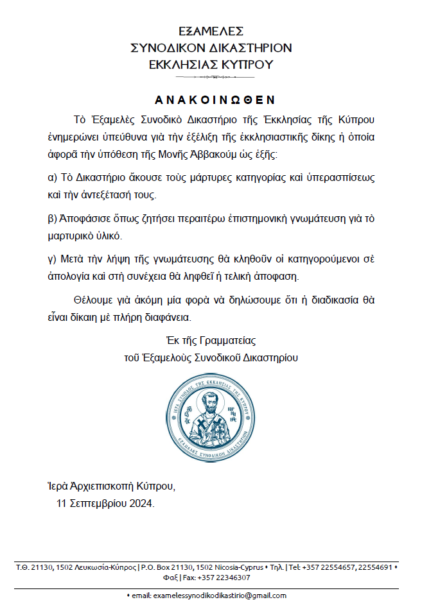 Τὸ Ἑξαμελὲς Συνοδικὸν Δικαστήριον τῆς Ἐκκλησίας τῆς Κύπρου ἐνημερώνει ὑπεύθυνα γιὰ τὴν ἐξέλιξη τῆς ἐκκλησιαστικῆς δίκης, ἡ ὁποία ἀφορᾶ στὴν ὑπόθεση τῆς Μονῆς Ἀββακούμ ὡς ἑξῆς:
