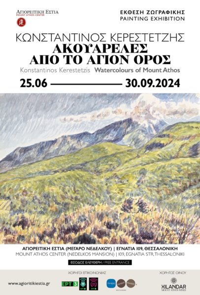 Συνεχίζεται έως τη Δευτέρα 30 Σεπτεμβρίου στον εκθεσιακό χώρο της Αγιορειτικής Εστίας, η έκθεση ζωγραφικής του Κωνσταντίνου Κερεστετζή με τίτλο «Ακουαρέλες από το Άγιον Όρος».