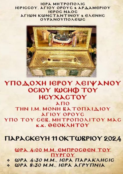 Τα Ιερά Λείψανα του Αγίου Ιωσήφ του Ησυχαστού θα υποδεχθεί σήμερα στις 4 το απόγευμα ο Ιερός Ναός των Αγίων Κωνσταντίνου και Ελένης Ουρανούπολης.