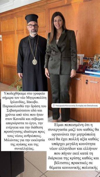 Συνάντηση με την Υπουργό Κοινωνικής Συνοχής και Οικογένειας, Σοφία Ζαχαράκη, καθώς και την Γενική Γραμματέα Απόδημου Ελληνισμού και Δημόσιας Διπλωματίας, Μάιρα Μυρογιάννης, είχε εχθές στην Αθήνα ο Μητροπολίτης Ιρλανδίας κ. Ιάκωβος.