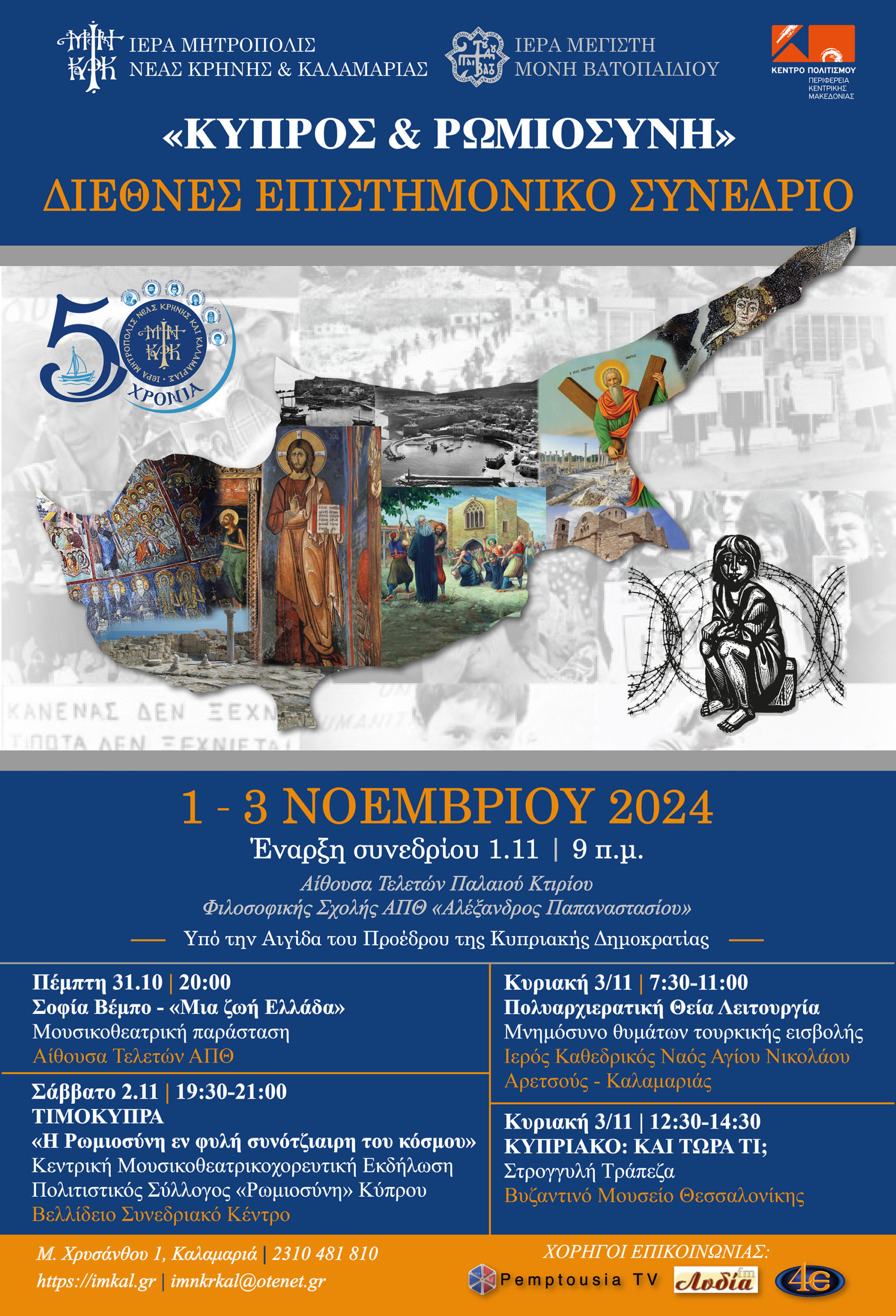 Με αφορμή την συμπλήρωση πενήντα ετών από την εισβολή και κατοχή της Κύπρου και των τραγικών βίαιων γεγονότων που έζησε ο Κυπριακός Ελληνισμός, η Ιερά Μητρόπολη Νέας Κρήνης και Καλαμαριάς, η Ιερά Μεγίστη Μονή Βατοπαιδίου και το Κέντρο Πολιτισμού της Περιφέρειας Κεντρικής Μακεδονίας, διοργανώνουν Διεθνές Επιστημονικό Συνέδριο με τίτλο «Κύπρος και Ρωμιοσύνη».