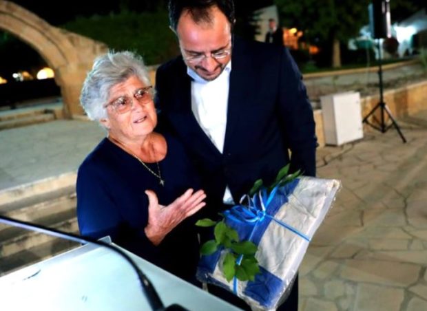 ΑΚΡΩΣ συγκινητικές έγιναν αίφνης οι στιγμές το βράδυ της Τετάρτης στον κήπο του Προεδρικού. Όταν στην παρουσίαση του βιβλίου της Ευρυδίκης Περικλέους – Παπαδοπούλου, με τίτλο «Και πολλά επικράνθη η Ελένη της Καρπασίας», ανέβηκε στο βήμα για την δική της αντιφώνηση η ίδια η ηρωική Δασκάλα (1974-1997) της σκλαβωμένης Αγίας Τριάδας, Ελένη Φωκά. Λυγμική μεν η φωνή της. Ξεχειλισμένη όμως αποφασιστικότητα, πείσμα και πίστη. Σκόρπισε εθνική ανατριχίλα. Κι αιφνιδίασε τον ΠτΔ, Νίκο Χριστοδουλίδη, ο οποίος αμέσως σηκώθηκε στην πρόσκλησή της, για να παραλάβει από τα χέρια της, διπλωμένη μέσα σε κλαδιά δάφνης, μια γαλανόλευκη σημαία μας, δικό της βασανισμένο ιερό κειμήλιο από το σκλαβωμένο χωριό της. Είπε η βιαίως εκτοπισθείσα το 1997 κι έκτοτε απαγορευμένη από το τουρκικό κατοχικό καθεστώς Δασκάλα: