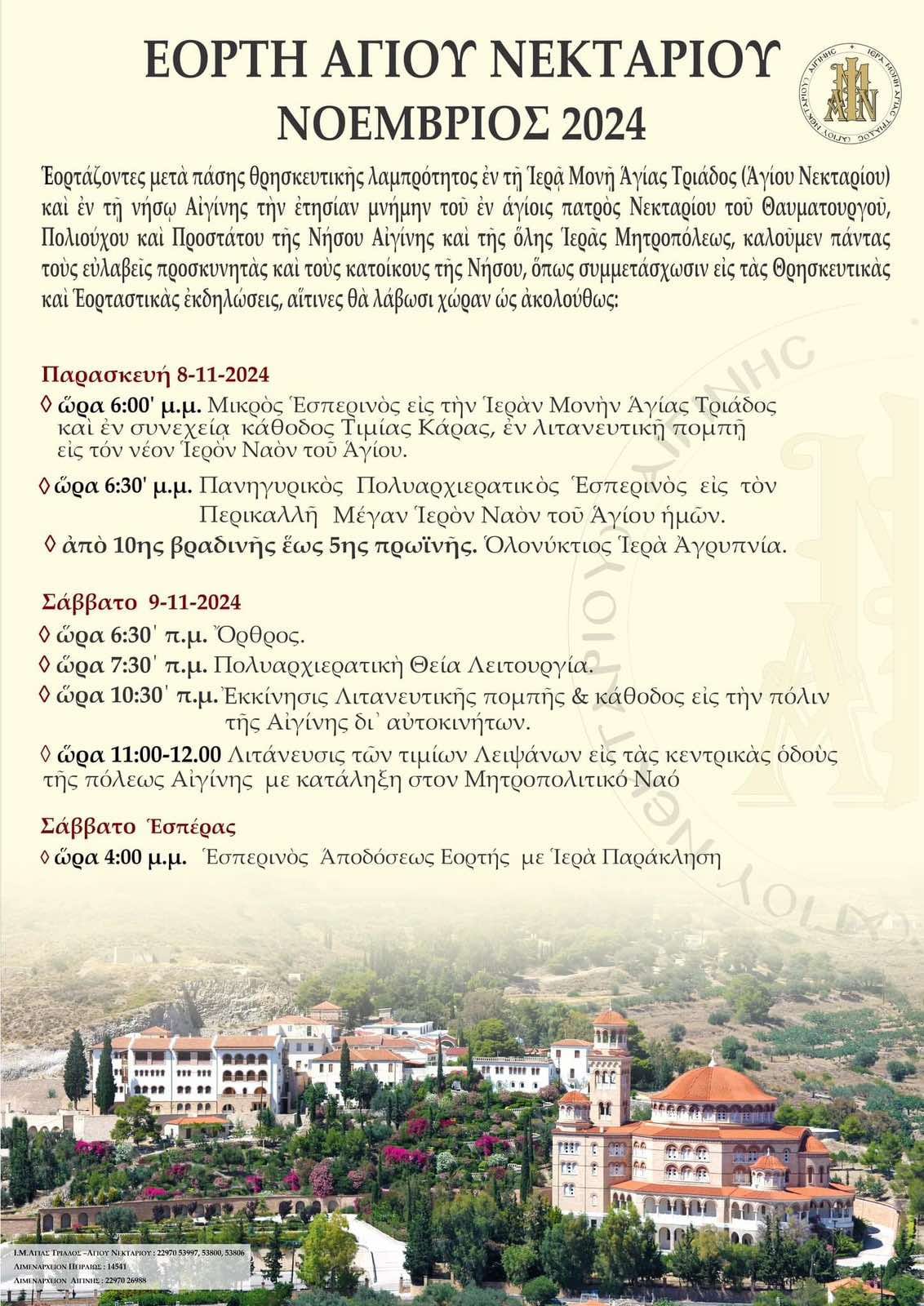Πανηγυρίζει η Ιερά Μονή Αγίας Τριάδος που ίδρυσε ο Άγιος Νεκτάριος στην Αίγινα. Για την εορτή θα πραγματοποιηθούν θρησκευτικές και εορταστικές εκδηλώσεις προς τιμήν του Αγίου το διήμερο 8 και 9 Νοεμβρίου.