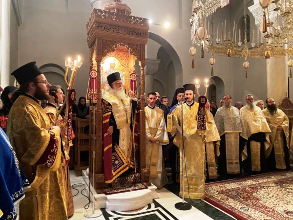 Στον Μέγα Πανηγυρικό Εσπερινό, τον οποίο αναμετέδωσε ζωντανά το Pemptousia FM, χοροστάτησε ο Σεβ. Μητροπολίτης Δημητριάδος κ. Ιγνάτιος, παρουσία του Υφυπουργού Κλιματικής Κρίσης και Πολιτικής Προστασίας της Ελλάδας κ. Χρήστου Τριαντόπουλου, της Αντιπεριφερειάρχη ΠΕ Μαγνησίας και Σποράδων κ. Άννας Μαρίας Παπαδημητρίου, του Δ/κτού της 1ης Στρατιάς Αντιστρατήγου Δημόκριτου Κωνσταντάκου, του Δ/κτού της 32ης Ταξιαρχίας Πεζοναυτών Ταξιάρχου Χρήστου Σπανίδη, του Γενικού Περιφερειακού Διοικητού του Λιμενικού Σώματος, του Αστυνομικού Διευθυντού Μαγνησίας Γεωργίου Ντιζέ και εκπροσώπων των Στρατιωτικών Αρχών.