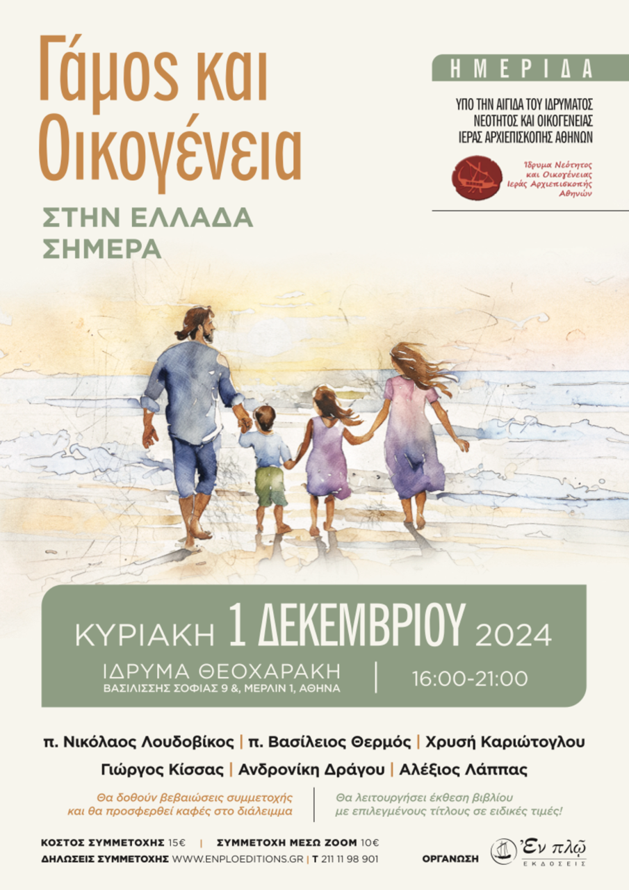Οι εκδόσεις Εν Πλω, υπό την αιγίδα του Ιδρύματος Νεότητας και Οικογένειας της Ιεράς Αρχιεπισκοπής Αθηνών, διοργανώνουν ημερίδα με θέμα «Γάμος και Οικογένεια στην Ελλάδα, σήμερα», την Κυριακή 1η Δεκεμβρίου, στο Ίδρυμα Θεοχαράκη.