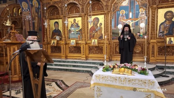 Καλωσορίζοντας τον Μητροπολίτη Αργολίδος ανέφερε: «έχουμε σήμερα την μεγάλη ευλογία και χαρά να φιλοξενούμε τον Σεβασμιώτατο Μητροπολίτη Αργολίδος κ. Νεκτάριο, ο οποίος μας εκόμισε προς προσκύνηση την ιερά αυτή λειψανοθήκη, η όποια περιέχει λείψανα τριών μεγάλων Αγίων: του Οσίου και Θεοφόρου Πατρός ημών Αθανασίου του Χαμακιώτου, του Όσιου και Θεοφόρου Πατρός ημών Αρσενίου του Καππαδόκου και του Οσίου και Θεοφόρου Πατρός ημών Εφραίμ του Κατουνακιώτου. Παράλληλα θα μας μιλήσει για τον Άγιο Αθανάσιο που τόσο αγάπησε και συνδέθηκε μαζί του».