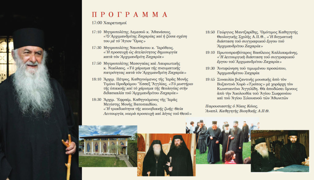 Η ημερίδα παρουσίασης του συγγραφικού έργου του π. Ζαχαρία θα πραγματοποιηθεί την Παρασκευή 22 Νοεμβρίου 2024 στο Θέατρο του Κολλεγίου Αθηνών με ώρα έναρξης 17.00.