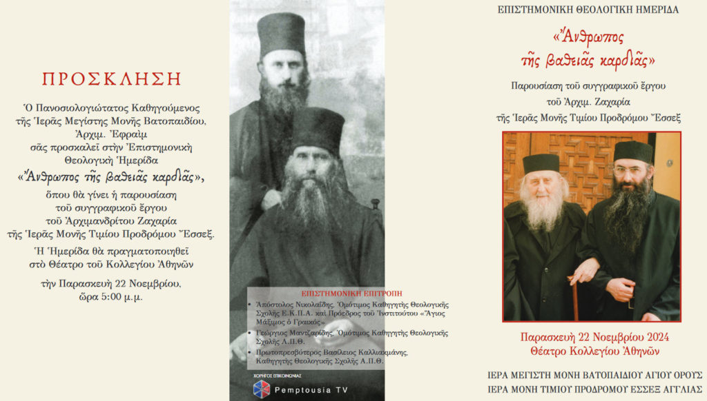 Η Ιερά Μεγίστη Μονή Βατοπαιδίου Αγίου Όρους σε συνεργασία με την Ιερά Μονή Τιμίου Προδρόμου Έσσεξ Αγγλίας διοργανώνουν Επιστημονική Θεολογική Ημερίδα με τίτλο «Άνθρωπος της βαθειάς καρδιάς». Η ημερίδα έχει ως σκοπό να παρουσιάσει το συγγραφικό έργο του Αρχιμανδρίτη π. Ζαχαρία της Ιεράς Μονής Τιμίου Προδρόμου.