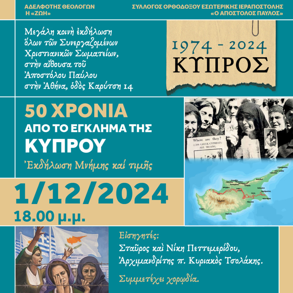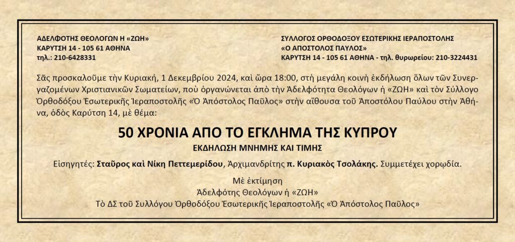 Κοινή εκδήλωση όλων των Συνεργαζομένων Χριστιανικών Σωματείων για τα “50 χρόνια από το έγκλημα της Κύπρου. Εκδήλωση μνήμης και τιμής” διοργανώνεται από τον Σύλλογο Ορθοδόξου Εσωτερικής Ιεραποστολής «Ο Απόστολος Παύλος» και την Αδελφότητα Θεολόγων «Ζωή» την Κυριακή 1η Δεκεμβρίου στις 18:00, στην αίθουσα του Αποστόλου Παύλου στην Αθήνα, οδός Καρύτση 14.