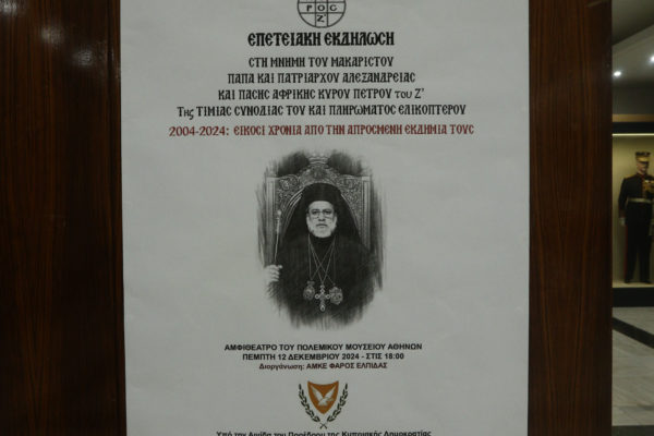 Με αφορμή τη συμπλήρωση φέτος είκοσι χρόνων από την απρόσμενη εκδημία σε αεροπορικό δυστύχημα του ιδρυτού της ΜΚΟ “Φάρος Ελπίδας” Πάπα και Πατριάρχου Αλεξανδρείας και πάσης Αφρικής κυρού Πέτρου του Ζ’, διοργάνωσε την Πέμπτη 12 Δεκεμβρίου, στο αμφιθέατρο του Πολεμικού Μουσείου Αθηνών, επετειακή εκδήλωση στη μνήμη του. Η εκδήλωση τελούσε υπό την αιγίδα του Προέδρου της Κυπριακής Δημοκρατίας.
