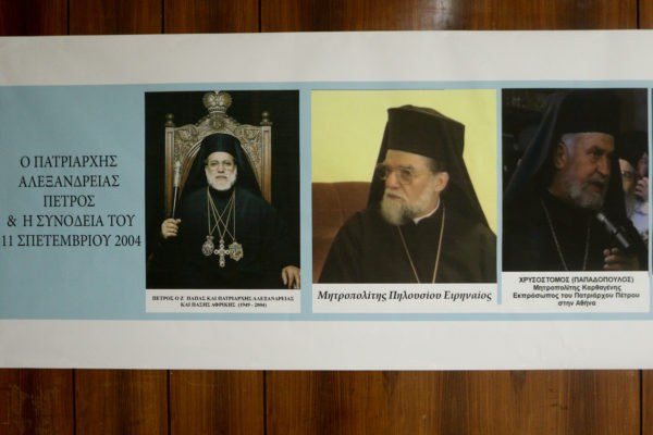 Στην είσοδο του χώρου της εκδήλωσης υπήρχε φωτογραφικό υλικό με τα πρόσωπα των 16 θυμάτων, συνταξιδιωτών του, που τόσο άδικα έχασαν την ζωή τους την μοιραία εκείνη ημέρα της 11ης Σεπτεμβρίου 2004 στο τραγικό αεροπορικό δυστύχημα (ελικόπτερο Σινούκ). Μεταξύ των θυμάτων ήταν ο Πατριάρχης Αλεξανδρείας Πέτρος Ζ’, τρεις Ιεράρχες του Πατριαρχείου Αλεξανδρείας, δύο Αρχιμανδρίτες, ένας διάκονος, πέντε ακόλουθοι του Πατριάρχη και το πενταμελές πλήρωμα του Σινούκ.