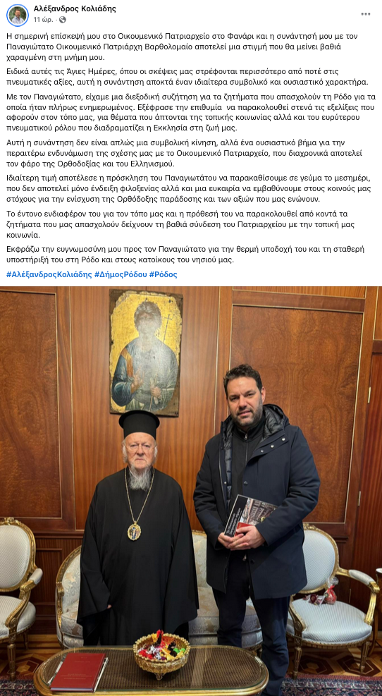 Αναφερόμενος στη συνάντηση του με τον Οικουμενικό Πατριάρχη σε μέσο κοινωνικής δικτύωσης, ο κ. Κολιάδης την χαρακτηρίζει «στιγμή που θα μείνει βαθιά χαραγμένη στη μνήμη» του.