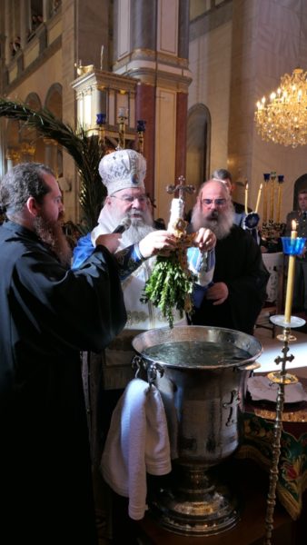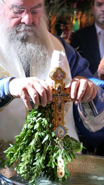 Ακολούθως, εν πομπή, κλήρος και λαός κατευθύνθηκαν προς την αποβάθρα του παλίου Λιμανιού της πόλης και αγίασαν τα ύδατα. Πολλοί ήταν αυτοί που βούτηξαν στην θάλασσα να πάρουν την ευλογία από τον Τίμιο Σταυρό.