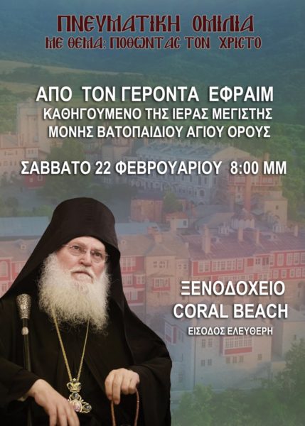 Πνευματική ομιλία από τον Γέροντα Εφραίμ, Καθηγούμενο της Ιεράς Μεγίστης Μονής Βατοπαιδίου Αγίου Όρους, Σάββατο 22 Φεβρουαρίου 2025, στις 8:00 μ.μ. στο ξενοδοχείο CORAL BEACH.