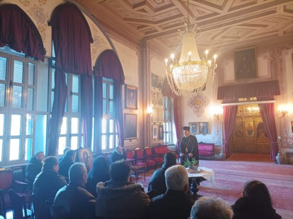 Τον Σεβασμιώτατο και τους πολυπληθείς προσκυνητές υποδέχθηκε στο Μέγα Συνοδικό της Σχολής ο Καθηγούμενος, Θεοφιλέστατος Επίσκοπος Αραβισσού κ. Κασσιανός, αναφερόμενος στην ιστορία και την σημερινή παρουσία της Θεολογικής Σχολής.
