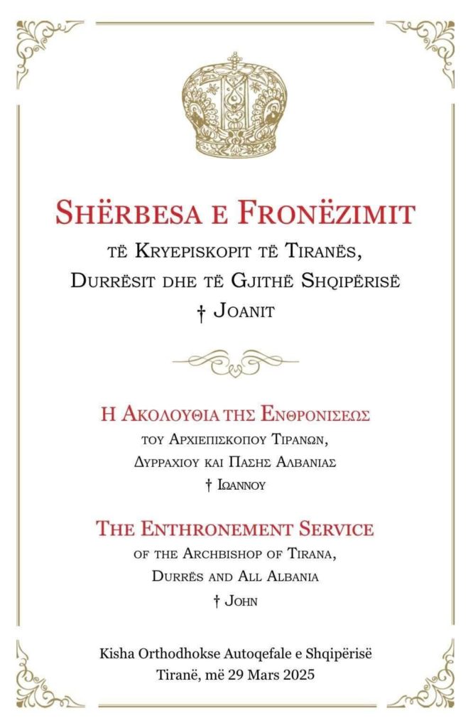 Με το “Ευλογημένος ο Ερχόμενος εν ονόματι Κυρίου” και σε κλίμα πνευματικής χαράς η Αρχιεπισκοπή Τιράνων και η Εκκλησία της Αλβανίας ετοιμάζονται να υποδεχθούν το νέο τους Προκαθήμενο. Tο Σάββατο, 29 Μαρτίου 2025, στον Καθεδρικό Ναό της Αναστάσεως του Κυρίου, στο ναό σύμβολο και ενότητας στην αλβανική πρωτεύουσα τον οποίο οραματίστηκε και δημιούργησε ο μακαριστός Αρχιεπίσκοπος Αναστάσιος, θα πραγματοποιηθεί η ενθρόνιση του από Κορυτσάς νέου Αρχιεπισκόπου Τιράνων, Δυρραχίου και πάσης Αλβανίας κ.κ. Ιωάννου.