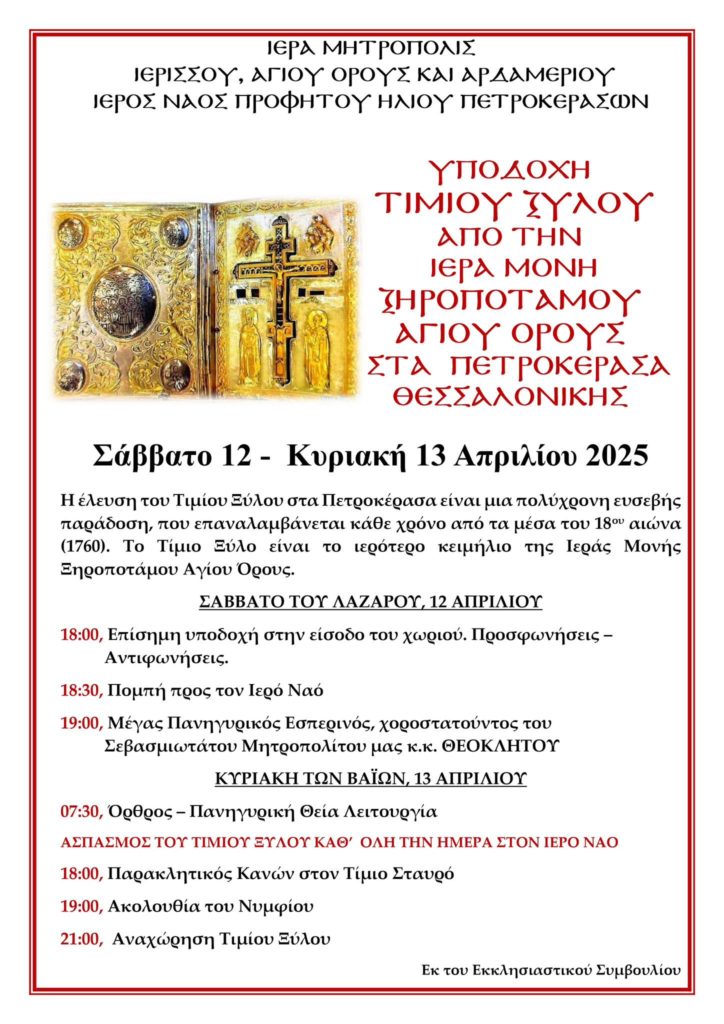 Ο Ιερός Ναός Προφήτου Ηλίου Πετροκεράσων Θεσσαλονίκης θα υποδεχτεί το Τίμιο Ξύλο από την Ιερά Μονή Ξηροποτάμου Αγίου Όρους το Σάββατο του Λαζάρου 12 Απριλίου, και θα παραμείνει έως τις 13 Απριλίου.
