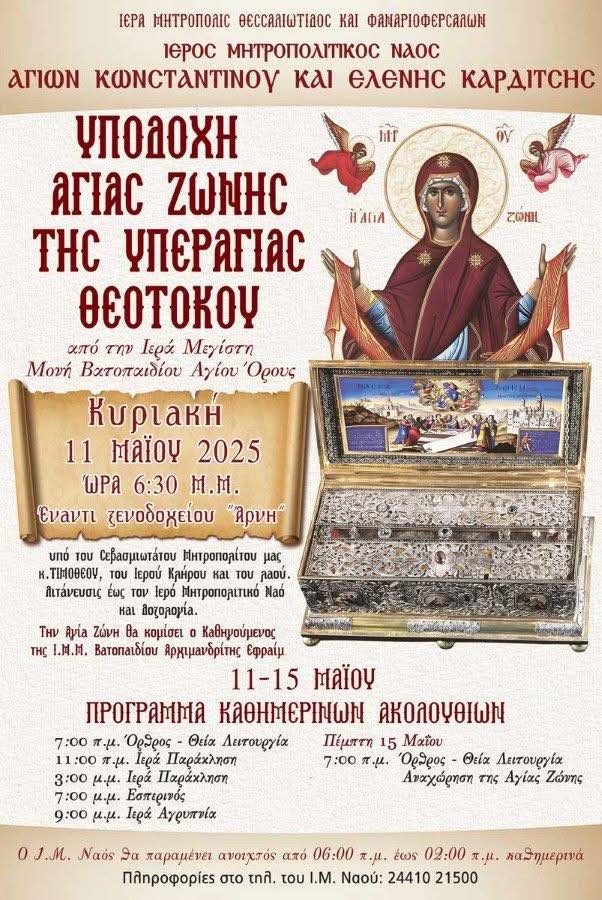 Η Τιμία Ζώνη της Υπεραγίας Θεοτόκου στην Καρδίτσα προς προσκύνηση και αγιασμό των ευλαβών Χριστιανών. Η Τίμια Ζώνη της Υπεραγίας Θεοτόκου θα προσκομιστεί υπό του Καθηγουμένου της Ιεράς Μεγίστης Μονής Βατοπαιδίου Γέροντος Εφραίμ, την Κυριακή 11 Μαΐου 2025 στις 18:30 έναντι του ξενοδοχείου “Άρνη”, και θα παραμείνει έως 15 Μαΐου 2025 στον Ιερό Μητροπολιτικό Ναό Αγίων Κωνσταντίνου και Ελένης Καρδίτσης.