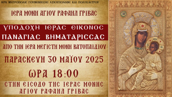 Μια μεγάλη Θεομητορική ευλογία από την Ιερά Μεγίστη Μονή Βατοπαιδίου, στις 30 Μαίου το απόγευμα, θα κομίσει ο πανοσιολογιότατος Καθηγούμενος Αρχιμ. Εφραίμ στην Ιερά Μονή Αγίων Ραφαήλ, Νικολάου και Ειρήνης Γουμενίσσης-Γρίβας: την Παναγία Βηματάρισσα, αγιογραφημένο στο Αγιογραφείο του Βατοπαιδίου πιστό αντίγραφο της εφέστιας ιστορικής και θαυματοβρύτου εικόνος του Βατοπαιδίου.
