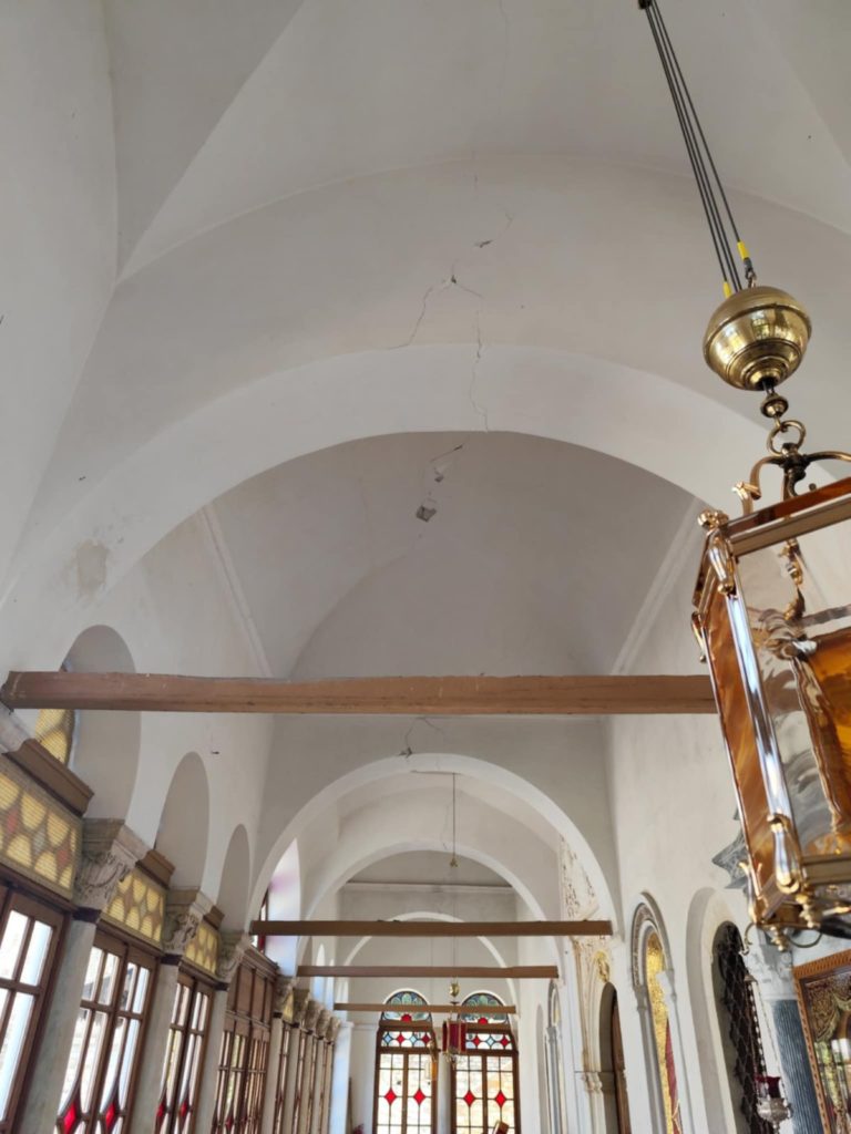Το κλιμάκιο της Εφορείας κατά την αυτοψία στο παλαιό καθολικό, μνημείο, του τέλους του 10ου αιώνα, κατάγραφο με τοιχογραφίες του 16ου αιώνα, διαπίστωσε ότι ο σεισμός προκάλεσε έντονες ρωγμές στους τρούλους, τόσο στον κυρίως ναό, όσο και στη λιτή, ενεργοποιώντας και τις παλαιές ρωγμές, κυρίως σε τόξα που είχαν κλείσει.