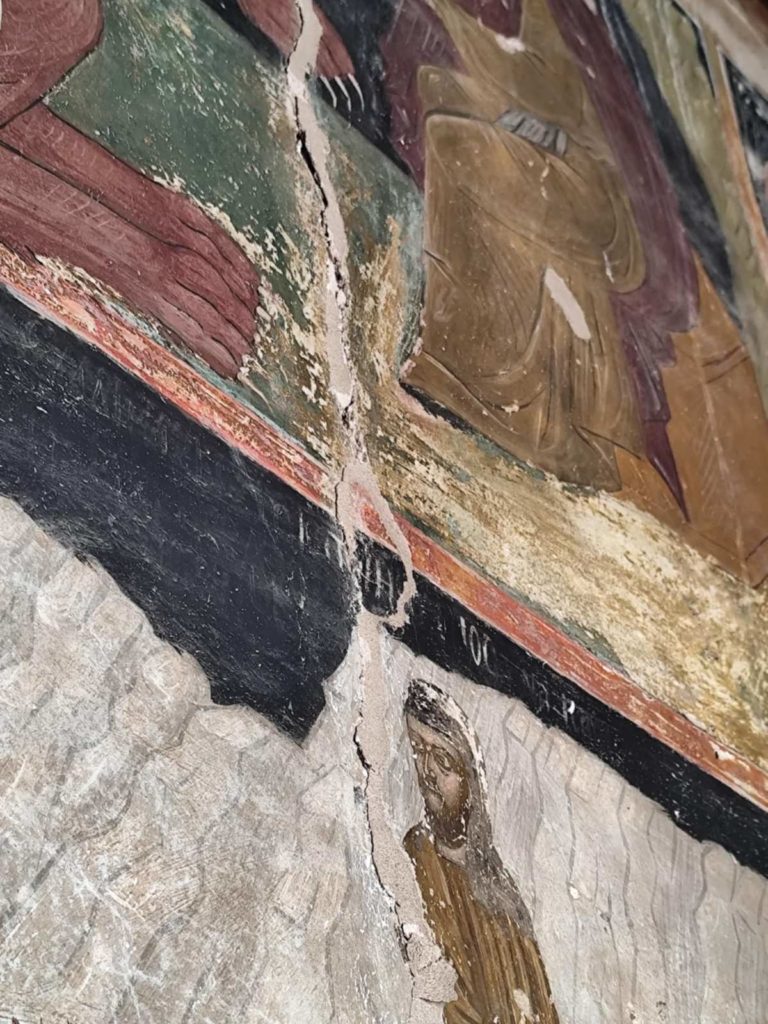 Οι ρωγμές, στις εσωτερικές τοιχογραφημένες επιφάνειες, προκάλεσαν, σε κάποια σημεία, ακόμα και αποκολλήσεις του ζωγραφικού στρώματος, έως και περιορισμένης κλίμακας πτώσεις επιχρισμάτων, με τοιχογραφίες. Αρκετές από αυτές τις ζημίες είχαν προκληθεί από τον σεισμό της 15ης Φεβρουαρίου 2025, ωστόσο με τον πρόσφατο σεισμό παρουσιάστηκε επιδείνωση. Η Εφορεία, άμεσα, μετά τις φθορές του σεισμού της 15ης Φεβρουαρίου, με συνεργεία συντηρητών είχε εφαρμόσει σωστικά μέτρα επί των τοιχογραφιών σε σημεία που προκλήθηκαν οι ρωγμές, προκειμένου να συγκρατηθούν αποκολλημένες ζωγραφικές επιφάνειες. Με την ενέργεια αυτή απετράπησαν οι, μεγαλύτερης έκτασης, φθορές των τοιχογραφιών.