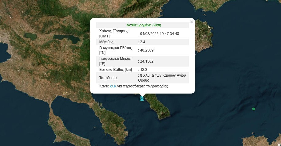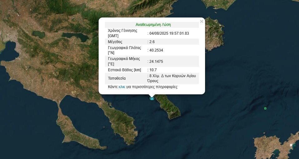 Σεισμική δόνηση μεγέθους 3,7 βαθμών της κλίμακας Ρίχτερ σημειώθηκε λίγο πριν τις 11 το βράδυ της Δευτέρας, 4 Αυγούστου, στο Άγιον Όρος.