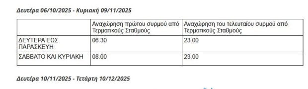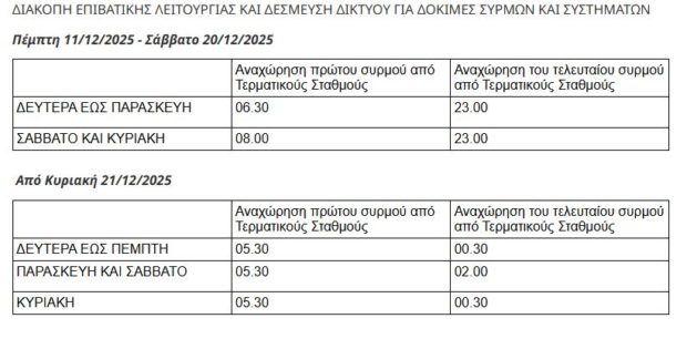 Κατά την περίοδο αυτή, καθώς και πριν και μετά από αυτήν, το πρόγραμμα των δρομολογίων του Μετρό θα τροποποιηθεί, όπως αναλυτικά παρουσιάζεται στους παρακάτω πίνακες, ώστε να διασφαλιστεί η ομαλή και απρόσκοπτη διεξαγωγή των δοκιμών του δικτύου προς την Καλαμαριά.