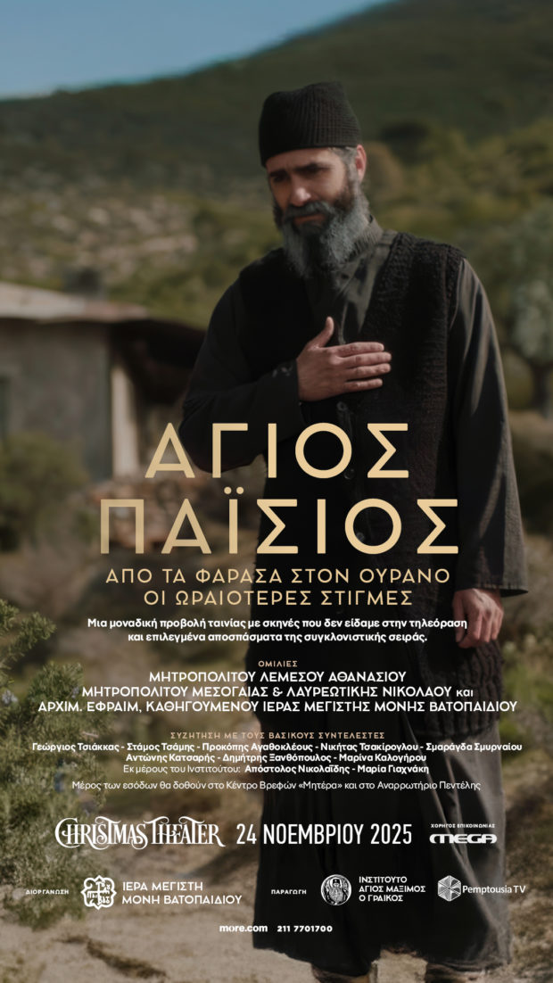 Τη Δευτέρα 24 Νοεμβρίου 2025 και ώρα 8:00 μ.μ., η ΙΕΡΑ ΜΕΓΙΣΤΗ ΜΟΝΗ ΒΑΤΟΠΑΙΔΙΟΥ διοργανώνει μία ξεχωριστή βραδιά αφιερωμένη στον Άγιο Παΐσιο, μέσα από την προβολή ταινίας με σκηνές που δεν είδαμε στην τηλεόραση και τα ωραιότερα αποσπάσματα της τηλεοπτικής σειράς «Άγιος Παΐσιος – Από τα Φάρασα στον Ουρανό», η οποία άγγιξε βαθιά τις καρδιές εκατομμυρίων ανθρώπων και προκάλεσε συγκίνηση σε όλη την Ελλάδα.