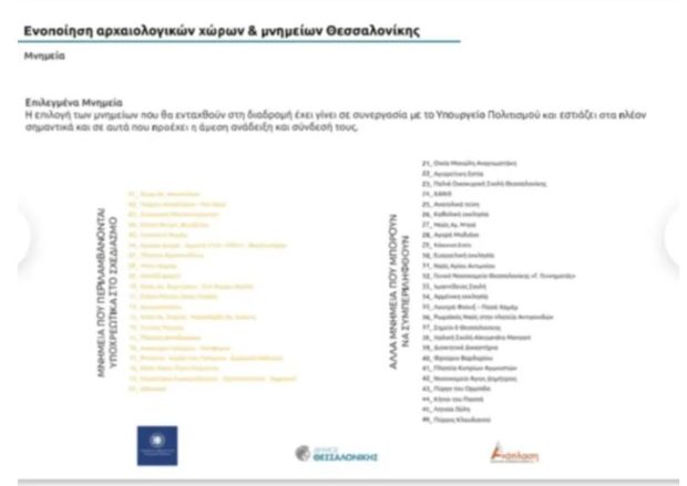 Όπως ανέφερε ο κ. Ακριτίδης τα επιλεγμένα μνημεία εντοπίζονται διάσπαρτα εντός του ιστορικού κέντρου της πόλης μεταξύ των οδών Ολυμπιάδος και Λεωφ. Νίκης καθώς και των οδών 26ης Οκτωβρίου και Αγγελάκη. «Ως κεντρικός άξονας σύνδεσης μεταξύ των μνημείων και των επί μέρους πολιτιστικών διαδρομών προτείνεται η οδός Εγνατία», υπογράμμισε. Η επιλογή των μνημείων που θα ενταχθούν έγινε σε συνεργασία με το υπουργείο Πολιτισμού και μεταξύ αυτών είναι ο Λευκός Πύργος, η Ροτόντα, το Ανάκτορο του Γαλερίου, ο Ναός Αγ. Αποστόλων, ο Πύργος Αναγλύφου – Τοπ Χανέ, οι στάσεις του Μετρό Βενιζέλου και Αγίας Σοφίας, η πλατεία Αριστοτέλους, η Παναγία Αχειροποίητος, η πλατεία Ιπποδρομίου, τα Κοιμητήρια Ευαγγελίστριας, ο Ναός Αγίου Δημητρίου.