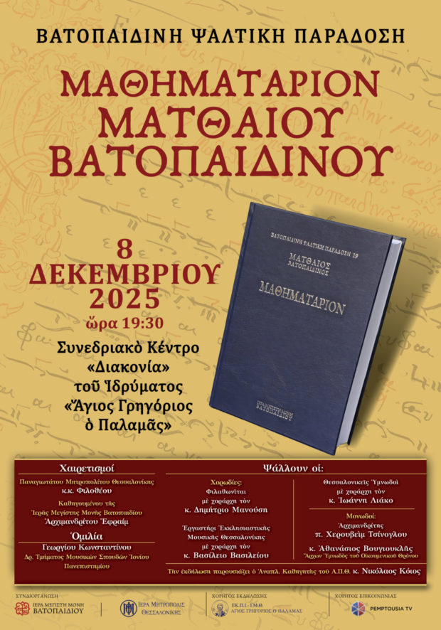 Η Ιερά Μεγίστη Μονή Βατοπαιδίου σε συνδιοργάνωση με την Ιερά Μητρόπολη Θεσσαλονίκης θα παρουσιάσουν το Μαθηματάριον του Μοναχού Ματθαίου του Βατοπαιδινού (1774-1849), μουσικού, κωδικογράφου, διδασκάλου της ψαλτικής τέχνης, σε εκδήλωση που θα πραγματοποιηθεί την Δευτέρα 8 Δεκεμβρίου 2025 και ώρα 7:30 μ.μ. στην Θεσσαλονίκη, στο Συνεδριακό Κέντρο «Διακονία» του Ιδρύματος «Άγιος Γρηγόριος ο Παλαμάς» (Ν. Πλαστήρα 65).