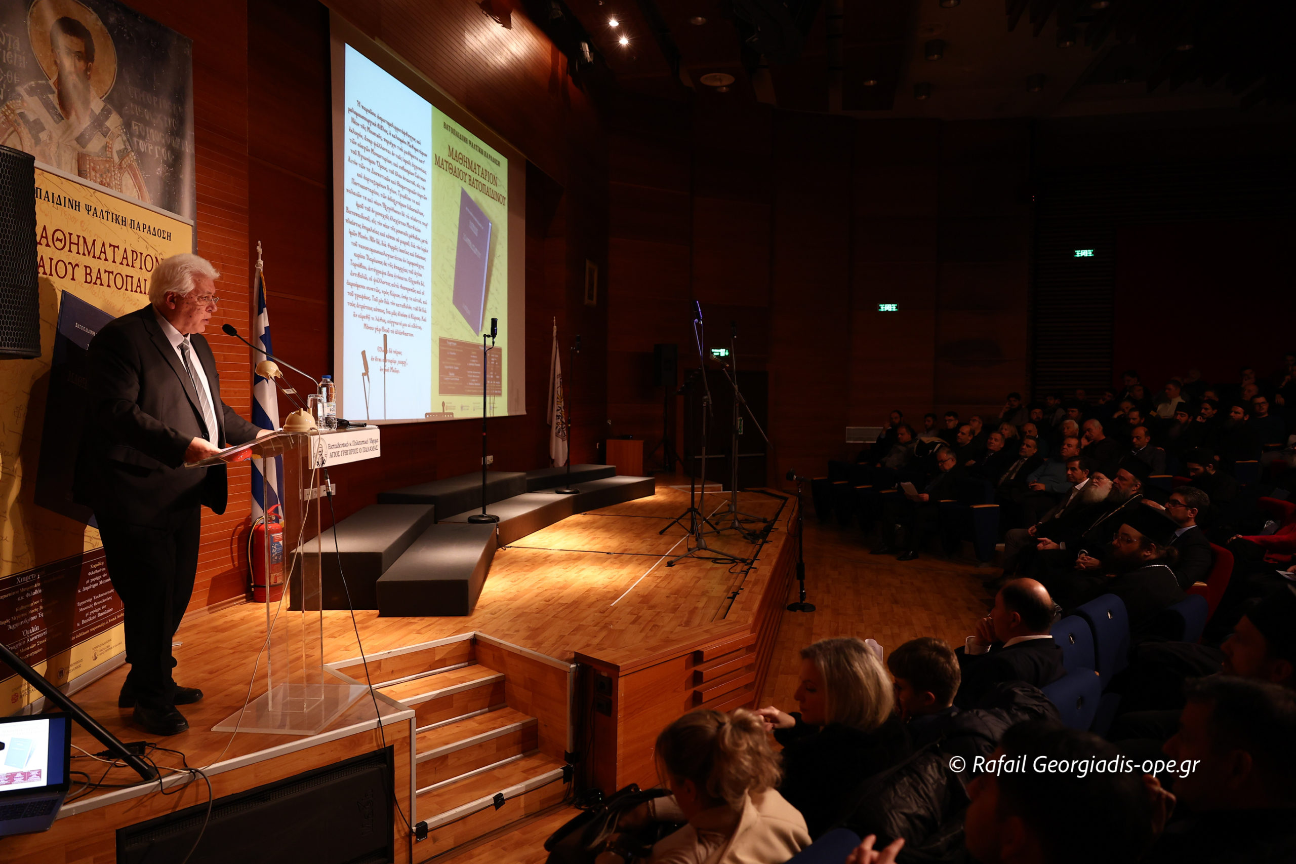 Το ακροατήριο κατέκλυσε από νωρίς την αίθουσα, ενώ την έναρξη σηματοδότησαν οι χαιρετισμοί του Παναγιωτάτου Μητροπολίτη Θεσσαλονίκης κ. Φιλοθέου και του Καθηγουμένου της Ιεράς Μεγίστης Μονής Βατοπαιδίου, Γέροντος Εφραίμ, οι οποίοι υπογράμμισαν τη σπουδαιότητα του έργου και την προσφορά του Ματθαίου στην ψαλτική παράδοση.