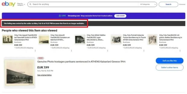 Δεν είναι πλέον διαθέσιμες προς πώληση οι φωτογραφίες στις οποίες απεικονίζονται οι τελευταίες στιγμές των 200 εκτελεσμένων κομμουνιστών της Καισαριανής την Πρωτομαγιά του 1944. Κάποιες από τις φωτογραφίες ξεπέρασαν τα 1.000 και 2.000 ευρώ όσο ήταν διαθέσιμες. Υπενθυμίζεται ότι η αγγελία για τη δημοπρασία έγινε γνωστή μέσω ανάρτησης της σελίδας Greece at WWII Archives στο Facebook.