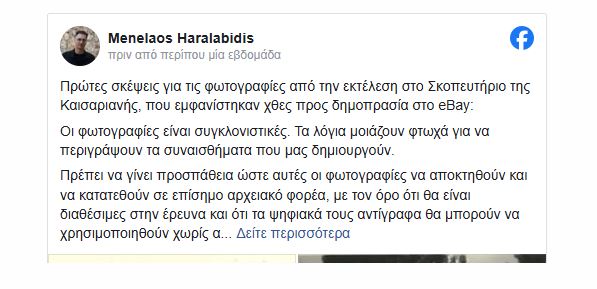 «Γνωρίζω ότι τα συναισθήματα γύρω από αυτό το θέμα μπορεί να είναι σημαντικά και λυπάμαι που το θέμα οικειοποιείται και πολιτικά», υπογραμμίζει ο ίδιος προσθέτοντας ότι «σήμερα το πρωί, αποφάσισα προσωπικά να κλείσω τις δημοπρασίες του eBay σχετικά με τις ιστορικές φωτογραφίες της Καισαριανής».