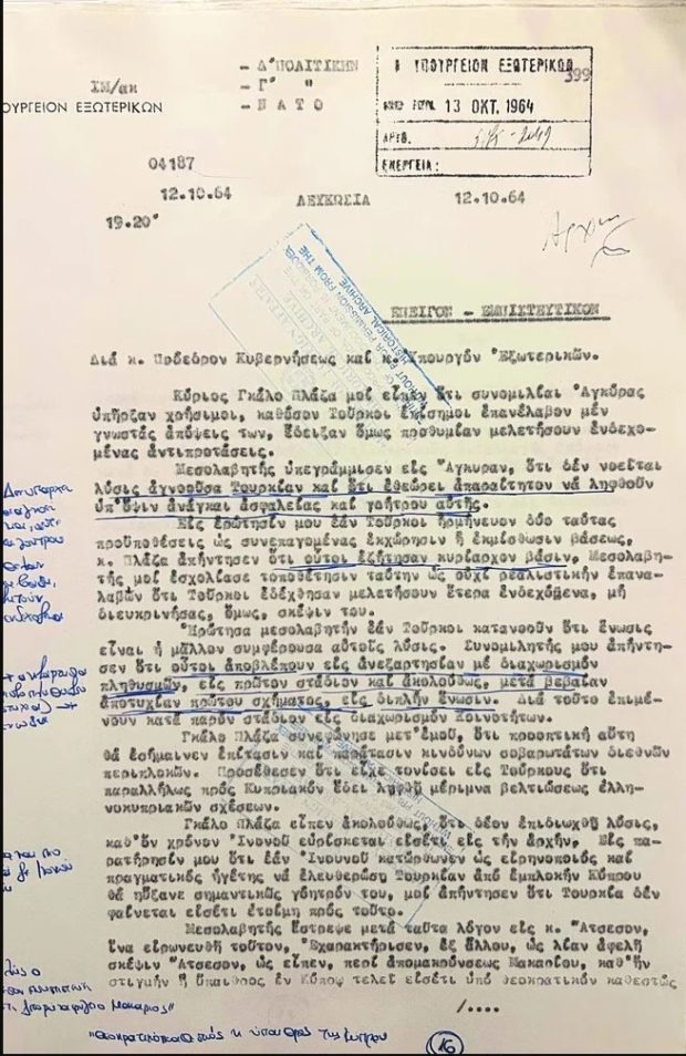Εμπιστευτικό έγγραφο του πρέσβη της Ελλάδας στην Κύπρο Μενέλαου Αλεξανδράκη προς το υπουργείο Εξωτερικών, με αποδέκτες τον πρωθυπουργό Γεώργιο Παπανδρέου και τον υπουργό Εξωτερικών Σταύρο Κωστόπουλο, με ημερομηνία 12 Οκτωβρίου 1964. Ο Αλεξανδράκης περιγράφει τα βασικά σημεία που αποκόμισε από τις επαφές του με τον τότε διαμεσολαβητή του ΟΗΕ για το Κυπριακό Γκάλο Πλάζα. Σύμφωνα με τον Πλάζα, η Τουρκία δεν πρόκειται να αποδεχθεί λύση χωρίς να ληφθούν υπόψη «οι ανάγκες της» στον τομέα της ασφάλειας, αλλά και το «γόητρό» της. Ο διαμεσολαβητής λέει στον Αλεξανδράκη ότι πρώτος στόχος των Τούρκων είναι ο διαχωρισμός των πληθυσμών και κατόπιν η «διπλή ένωση» (διχοτόμηση με παράλληλη ένωση του ελληνοκυπριακού τμήματος με την Ελλάδα).