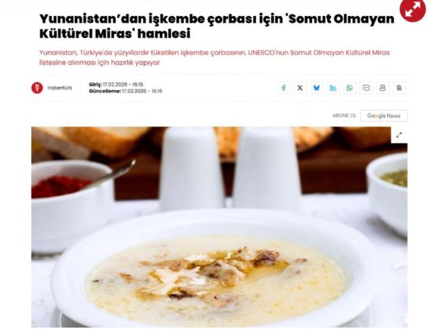 Η Habertürk σε δημοσίευμά της με τίτλο «Η Ελλάδα ξεκινά πρωτοβουλία για την άυλη πολιτιστική κληρονομιά του πατσά», ανέφερε ότι η Ελλάδα «ετοιμάζεται να συμπεριλάβει τη σούπα από πατσά, ένα πιάτο που καταναλώνεται στην Τουρκία εδώ και αιώνες, στον κατάλογο Άυλης Πολιτιστικής Κληρονομιάς της UNESCO».