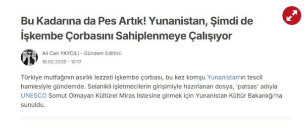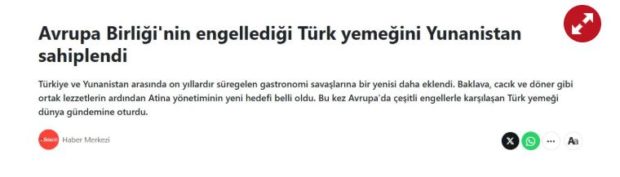 Ακόμη πιο αιχμηρή ήταν η προσέγγιση της Yeni Akit, η οποία με τίτλο «Έχουν βάλει στο μάτι την τουρκική κουζίνα! Οι Έλληνες κλέβουν άλλη μια από τις λιχουδιές μας» παρουσίασε την ελληνική πρωτοβουλία ως προσπάθεια «αρπαγής» στοιχείου της τουρκικής κουζίνας.