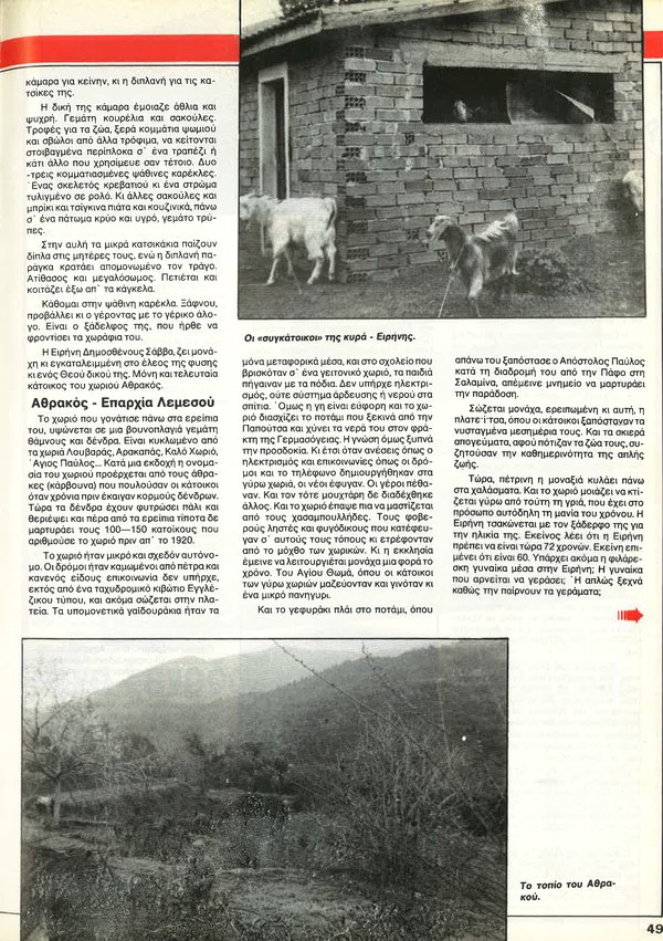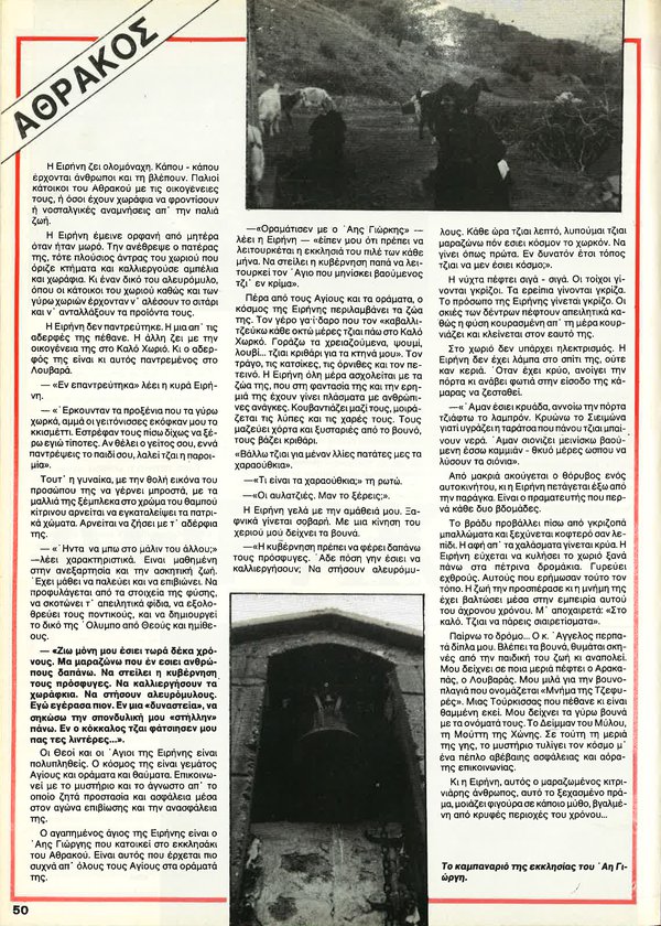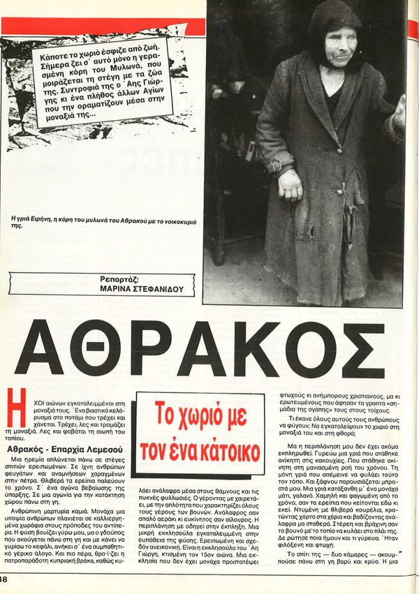 Το 1986, δημοσιογράφος του «Περιοδικού» ανακαλύπτει στον ερημωμένο Αθρακό της Λεμεσού τη μοναδική του κάτοικο, την κα Ειρήνη, η οποία έζησε εκεί μέχρι τα βαθιά της γεράματα, αρνούμενη να εγκαταλείψει τον τόπο της.