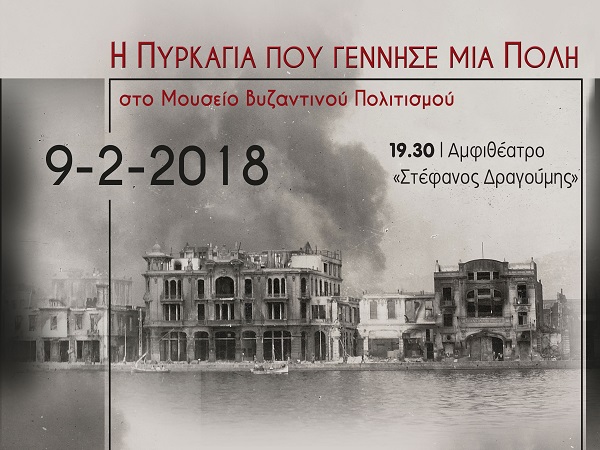Στο Μουσείο Βυζαντινού Πολιτισμού θα πραγματοποιηθεί εκδήλωση με τίτλο «Η πυρκαγιά που γέννησε μια πόλη», στο πλαίσιο της περιοδικής έκθεσης «Στη δίνη του Μεγάλου Πολέμου: Η Θεσσαλονίκη της Στρατιάς της Ανατολής (1915-1918)», η οποία θα λάβει χώρα την Παρασκευή 9 Φεβρουαρίου 2018 στις 19.30 στο αμφιθέατρο «Στέφανος Δραγούμης». Στο πρώτο μέρος της εκδήλωσης θα πραγματοποιηθούν ομιλίες από τον Αριστοτέλη Μέντζο, καθηγητή του Τμήματος Ιστορίας – Αρχαιολογίας του Α.Π.Θ. και την Αλέκα Καραδήμου-Γερόλυμπου, ομότιμη καθηγήτρια της Πολυτεχνικής Σχολής Α.Π.Θ. Την εκδήλωση παρουσιάζει και συντονίζει η Δρ Αγαθονίκη Τσιλιπάκου, Διευθύντρια του Μουσείου Βυζαντινού Πολιτισμού. Στο δεύτερο μέρος θα προβληθεί το ντοκιμαντέρ του σκηνοθέτη Γρηγόρη Βαρδαρινού με τίτλο «Θεσσαλονίκη 1917 - Η φωτιά που γέννησε μια πόλη». Το ντοκιμαντέρ παρουσιάζει φωτογραφικό υλικό και φιλμ της ...