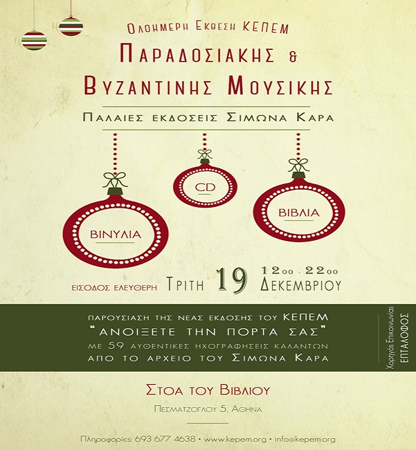 Οι παλαιές εκδόσεις του Σίμωνα Καρά, που μέχρι σήμερα είχαν αποσυρθεί από την κυκλοφορία, θα διατεθούν μετά από χρόνια για 1η φορά: Βιβλία – Βινύλια – CD Παράλληλα, θα διατίθενται σε έκπτωση όλες οι μουσικές εκδόσεις του πωλητηρίου του ΚΕΠΕΜ: Εκδόσεις ΚΕΠΕΜ | Σπάνιες τοπικές εκδόσεις | Εκδόσεις άλλων σημαντικών φορέων Στο πλαίσιο της έκθεσης, θα γίνουν οι ακόλουθες εκδηλώσεις: 6-7.30 μ.μ. | Επίσημη παρουσίαση της νέας έκδοσης του ΚΕΠΕΜ, “Ανοίξετε την πόρτα σας” με 59 αυθεντικές ηχογραφήσεις καλάντων από το αρχείο του Σίμωνα Καρά. 8-9.30 μ.μ. | “Σίμων Καράς και βυζαντινή μουσική“. Μικρό επιστημονικό αφιέρωμα στη συμβολή του Σίμωνα Καρά στη βυζαντινή μουσική, με ομιλίες των ερευνητών Ιωάννη Αρβανίτη και Γιώργου Λυκούρα. 59 κάλαντα από το Αρχείο του Σίμωνα Καρά | Επίσημη παρουσίαση Το ΚΕΠΕΜ ...