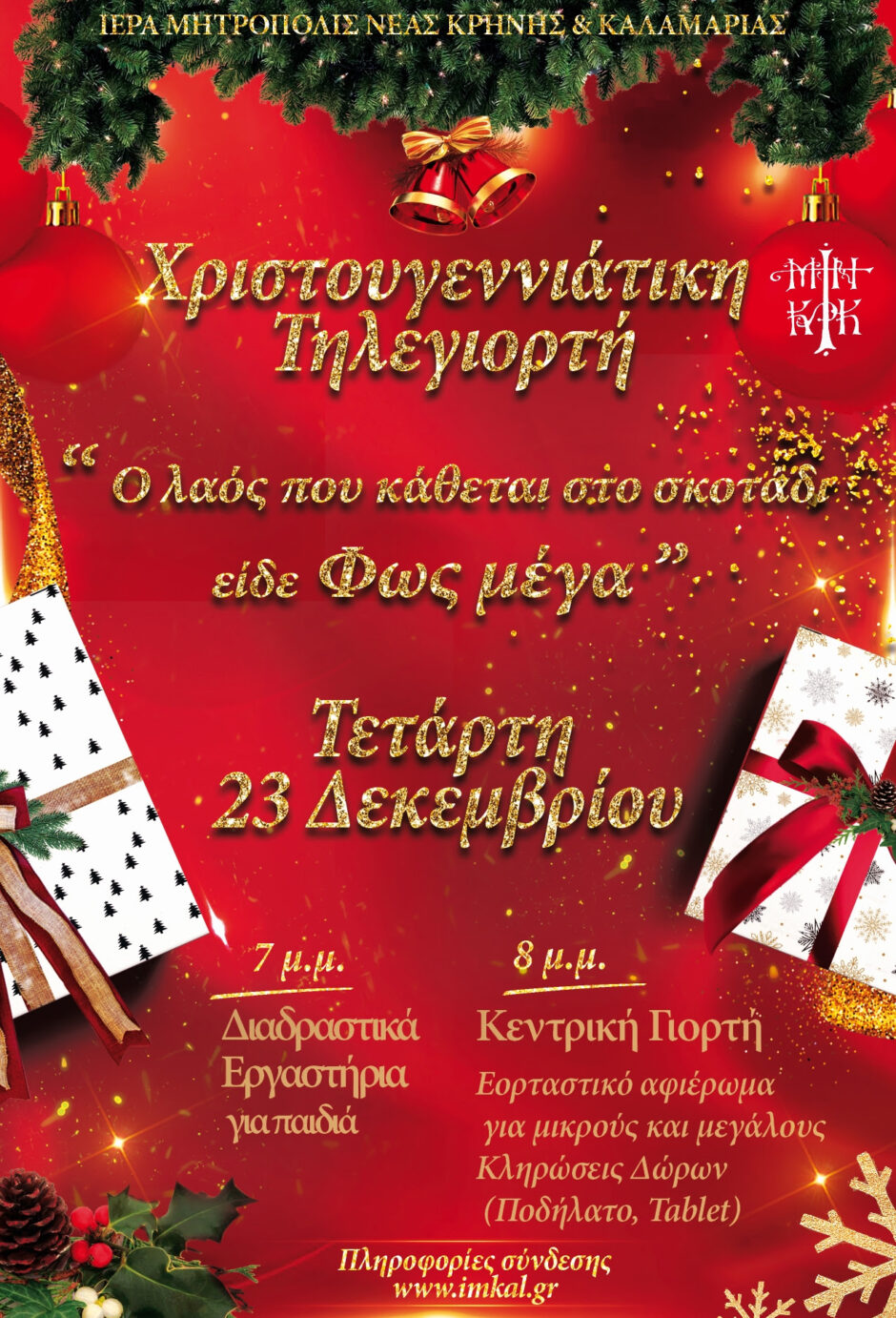 Ιερά Μητρόπολις Νέας Κρήνης & Καλαμαριάς ΧΡΙΣΤΟΥΓΕΝΝΙΑΤΙΚΗ ΤΗΛΕΓΙΟΡΤΗ «Ο λαός που κάθεται στο σκοτάδι είδε Φως μέγα» Με ιδιαίτερη τιμή σάς στέλνουμε πληροφοριακό υλικό για τη Χριστουγεννιάτικη Τηλεγιορτή που διοργανώνει η Ιερά Μητρόπολη Νέας Κρήνης και Καλαμαριάς σε συνεργασία με την pemptousia.gr. Τετάρτη 23 Δεκεμβρίου ΠΡΟΓΡΑΜΜΑ 19:00 Διαδραστικά Εργαστήρια και Τηλεπαιχνίδια Εργαστήριο κατασκευών (Κατασκευάζουμε Χριστουγεννιάτικα δέντρα και χιονονιφάδες από χαρτί και παλιά βιβλία) Δωμάτιο διαφυγής (escape room) με θέμα: «Αναζητώντας τα δώρα των μάγων» Παιχνίδια γνώσης με εορταστικά σταυρόλεξα Εργαστήριο καλών λογισμών Χριστουγεννιάτικες ερωτήσεις και γρίφοι Εργαστήριο μαγειρικής με απλές και γευστικές δημιουργίες από μπισκότα και σοκολάτα Διαδραστικά παραμύθια και αφηγήσεις 20:00 Κεντρική Εκδήλωση Πλούσιο εορταστικό αφιέρωμα με πρωταγωνιστές τα παιδιά που παρουσιάζουν ποιήματα και επίκαιρα μηνύματα, παραδοσιακά κάλαντα και έθιμα,ύμνους και χριστουγεννιάτικα τραγούδια, παραμύθια και διηγηματικές αφηγήσεις, ειδικά αφιερώματα, ψηφιακές δημιουργίες, ζωντανές συνδέσεις, ...