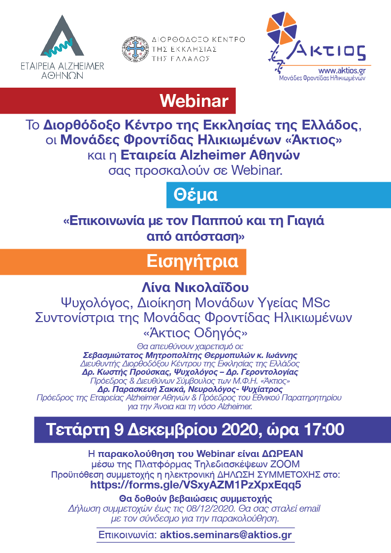 Aγαπητές φίλες, αγαπητοί φίλοι, τo Διορθόδοξο Κέντρο της Εκκλησίας της Ελλάδος, οι Μονάδες Φροντίδας Ηλικιωμένων «Άκτιος» και η Εταιρεία Alzheimer Αθηνών. σας προσκαλούν σε ένα επίκαιρο και σημαντικό για γονείς και εκπαιδευτικούς webinar με θέμα: «Επικοινωνία με τον Παππού και τη Γιαγιά από απόσταση» Τετάρτη 9 Δεκεμβρίου 2020, ώρα 17:00 Δηλώσεις συμμετοχής: https://forms.gle/VSxyAZM1PzXpxEqq5 Περισσότερες πληροφορίες για την εκδήλωση και το πρόγραμμα θα βρείτε στο συνημμένο αρχείο εδώ.