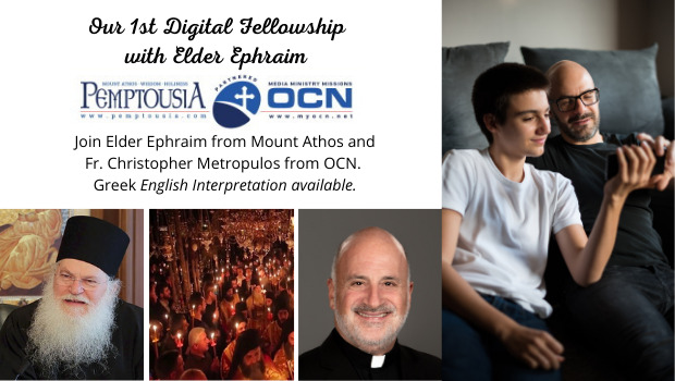 You are invited to participate in the “1st Digital Fellowship with Elder Ephraim, Abbot of the Holy Monastery of Vatopedi Mount Athos and the Orthodox Christian Network OCN“, which will take place Wednesday Dec 11, 2020 08:00 PM Athens time (1:00pm EST). Join us by registering in advance for this meeting by clicking on the following link: https://zoom.us/meeting/register/tJYsfuyhqDkiGtRDAN1fj8DENu7ftkHVXtcP After registering, you will receive a confirmation email containing information about joining the meeting. Elder Ephraim will talk in Greek and we will offer real time English Interpretation for the entire session, including the homily as well as the questions & answers. The e-Synaxis is organized by the web magazine PEMPTOUSIA and the OCN. If you need any help please contact nikos@gouraros.net or elenialexiou@myocn.net